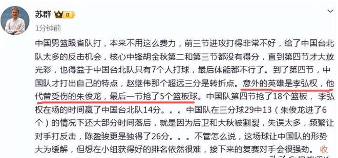 赛后苏群夸他是意外的英雄。他发文写道,“中国男篮跟省队打,本来不用这么费力,前三节进攻打得非常不好,给了中国台北队太多的反击机会,核心中锋胡金秋第二和第三节都没有得分,直到第四节才大放光彩,也得益于中国台北队只有7个人打球,最后体能都不行了。到了第四节,中国队才打出自己的特点,赵继伟那个超远三分是转折点。意外的英雄是李弘权,他代替受伤的朱俊龙,最后一节抢了5个篮板球。”李弘权是中国队今天最大的惊喜和英雄。你们说呢?